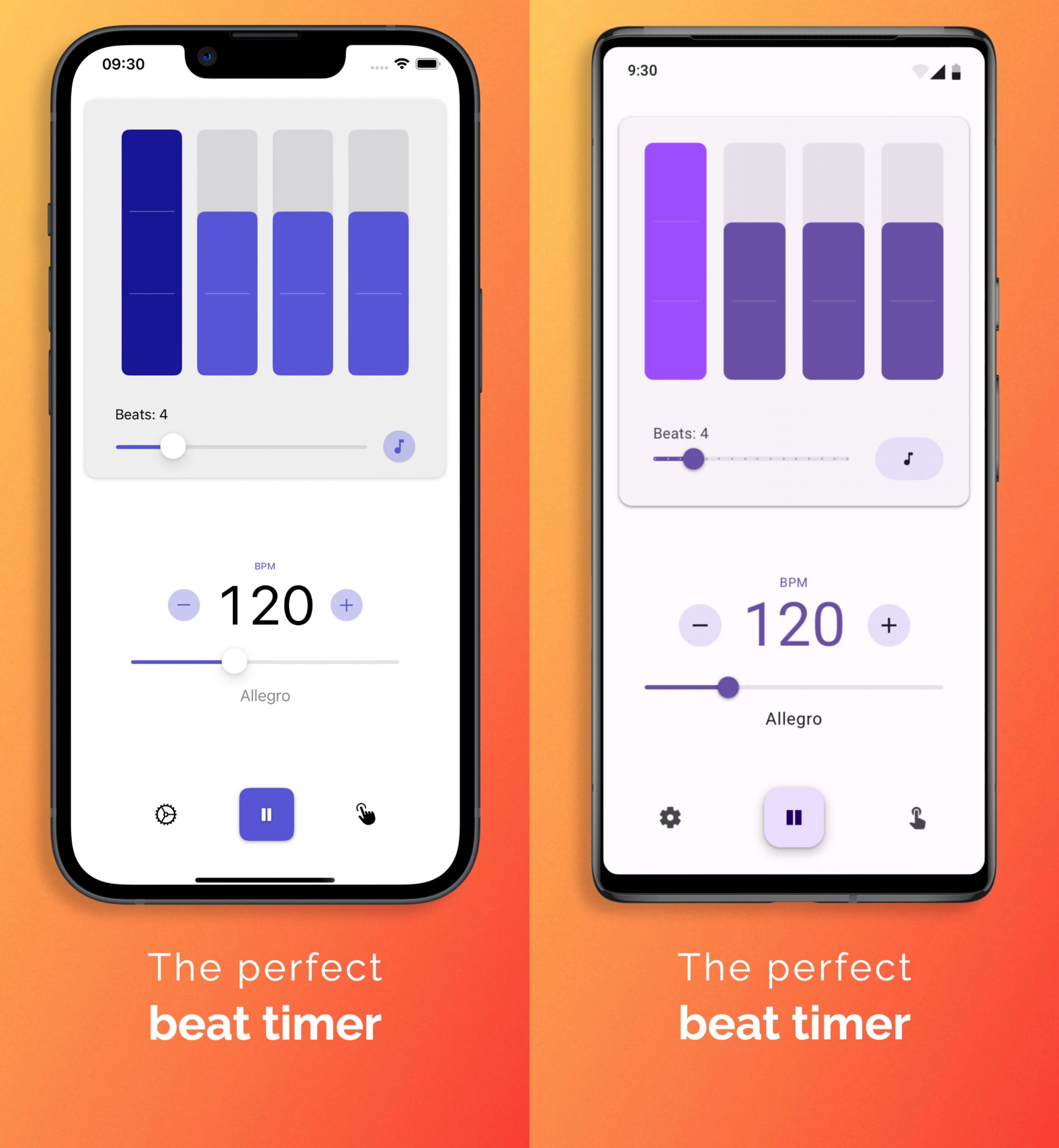 Easy Metronome is versatile and customizable. Select between various beat sounds and see the colors match your wallpaper choice on Android 13+ or choose between different theme colors on iOS.